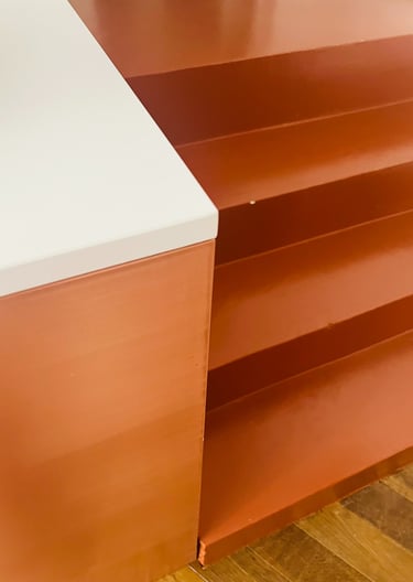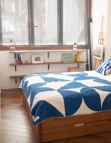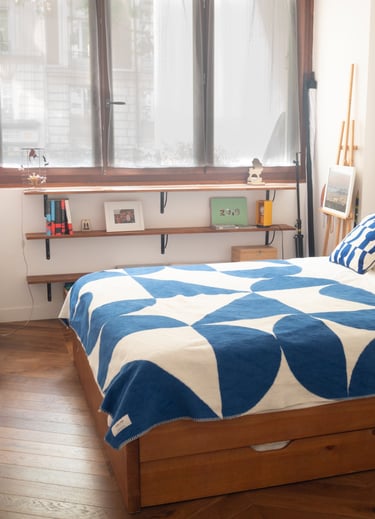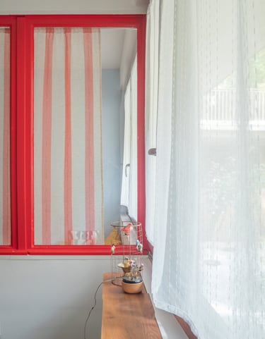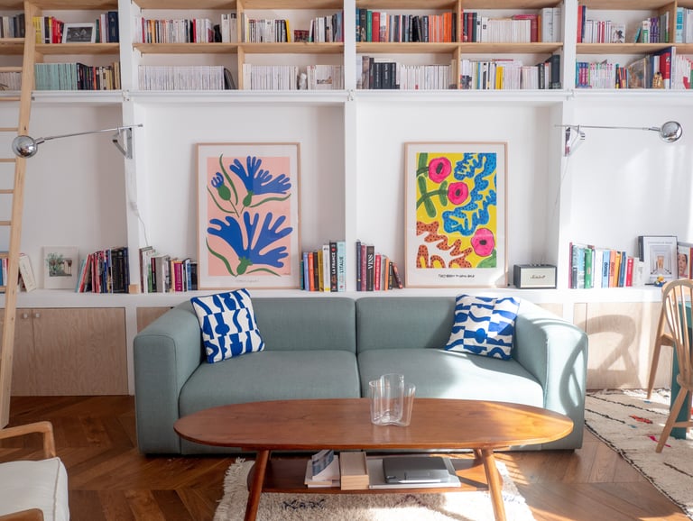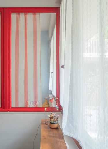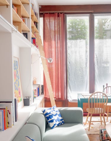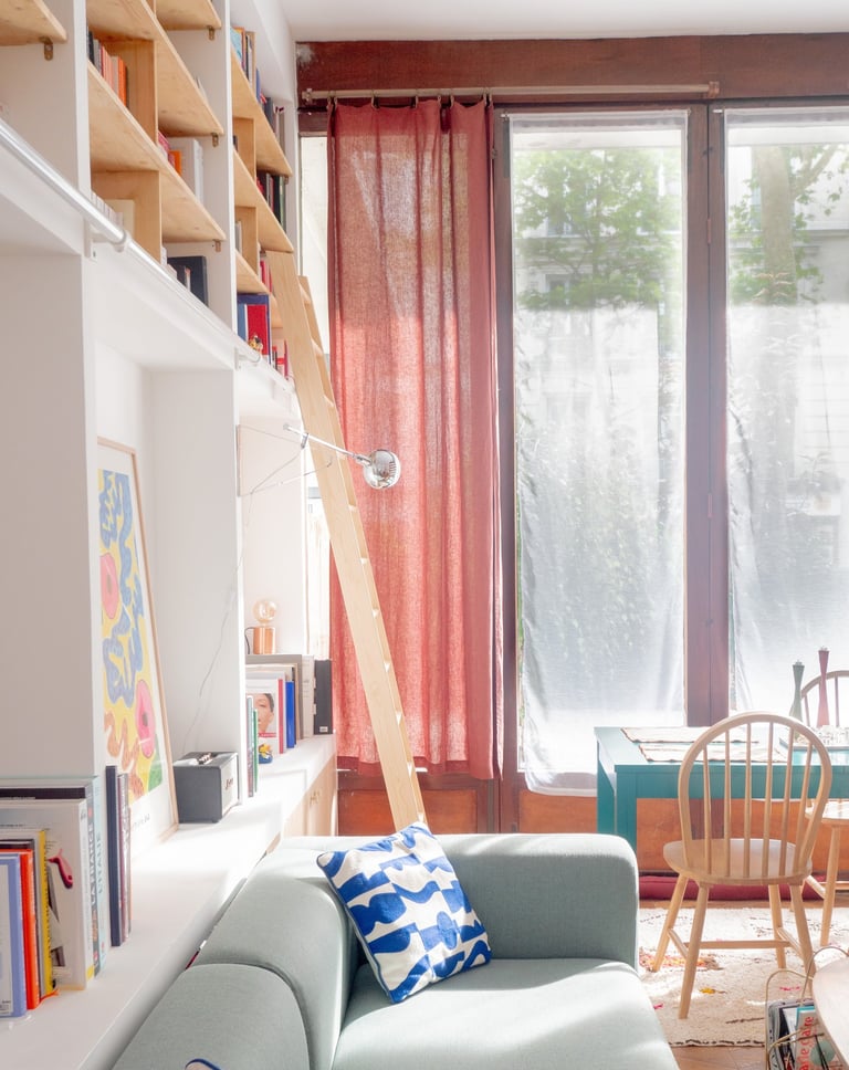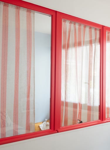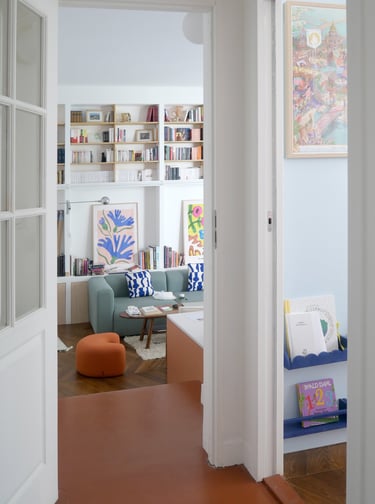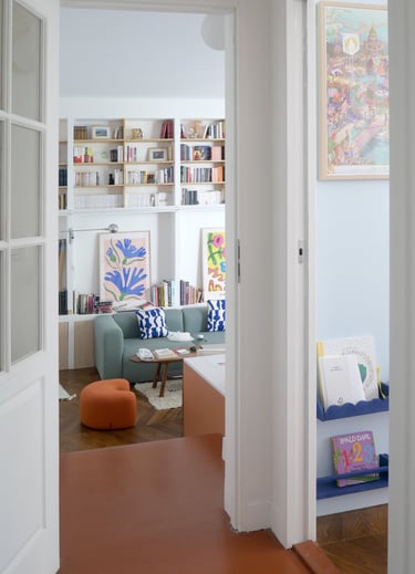 La grande hauteur sous plafond du salon a permis l’installation d’une bibliothèque sur mesure sans encombrer l’espace. L’espace nuit, composé de deux chambres, a été visuellement agrandi grâce à l’ajout d’une verrière réalisée à partir des anciennes menuiseries en bois des fenêtres. Le choix de couleurs, avec des menuiseries en bois rouge vif et un mur bleu clair, apporte une touche de gaieté.