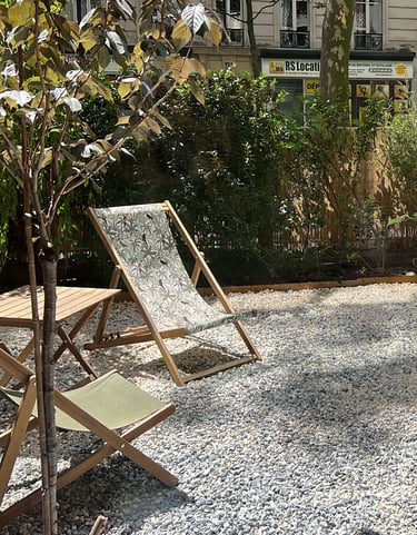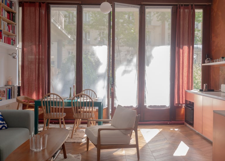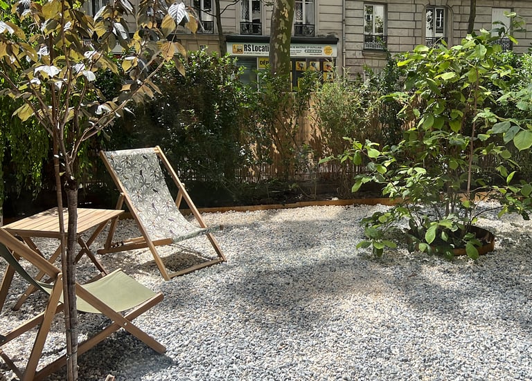 La transformation de cet appartement situé au rez-de-chaussée d'un immeuble parisien lui confère l'allure d'une maison de ville, notamment grâce à son ouverture sur un jardin privatif. Ce jardin a été entièrement repensé pour offrir une atmosphère intime. Deux espaces distincts y ont été aménagés : une zone minérale en prolongement du salon, agrémentée de deux bouleaux et d’un magnolia, et un coin salon d’été, niché entre une haie de bambous et un mur pignon recouvert des jasmins.