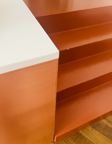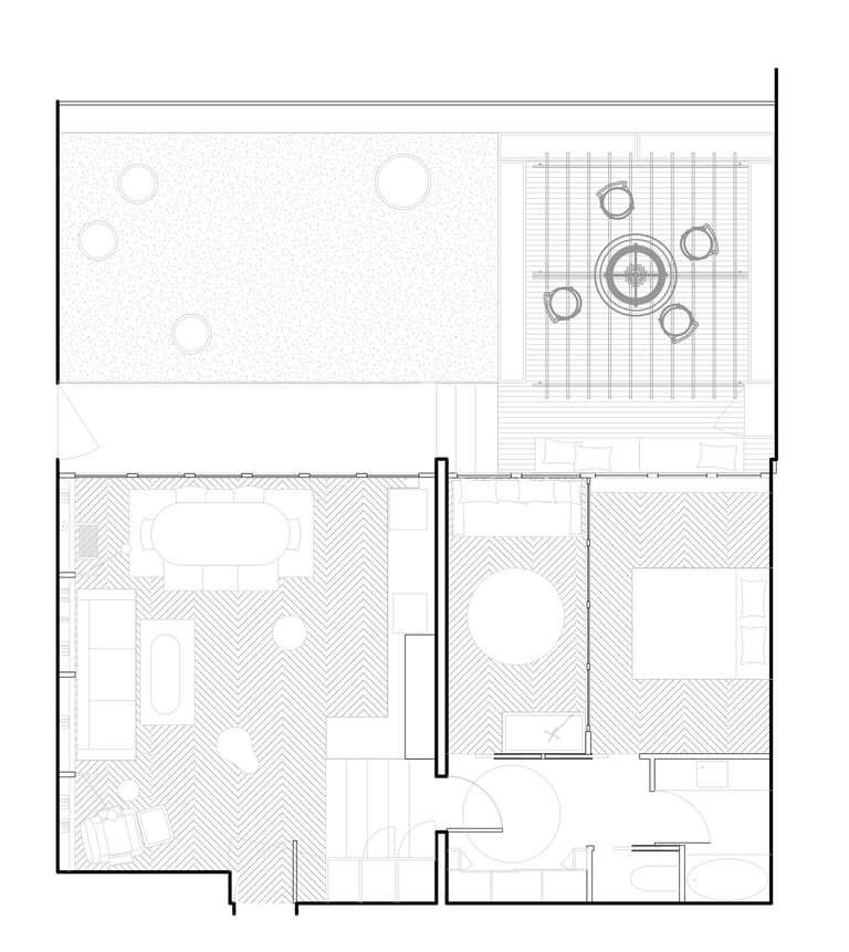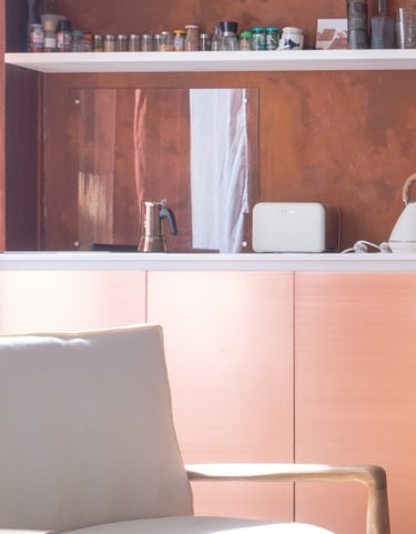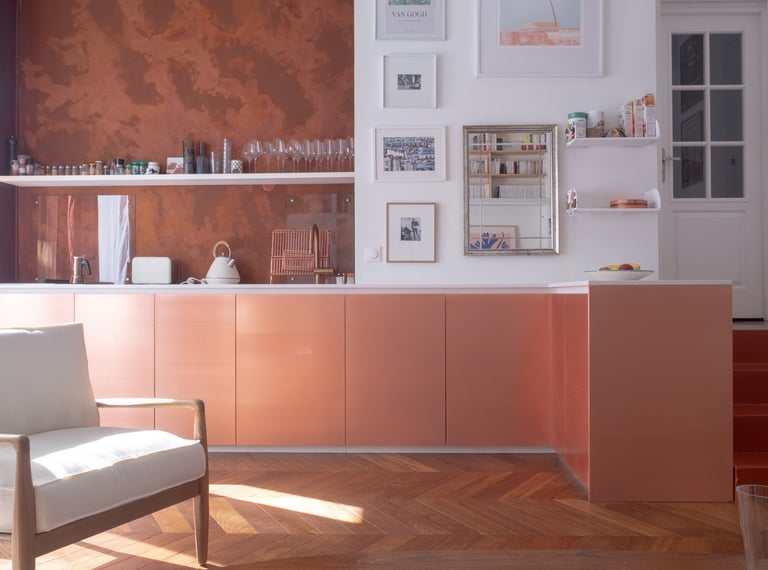 L’agencement atypique du lieu, avec 3,6 mètres de hauteur sous plafond dans le salon et un dénivelé de 80 cm séparant la zone nuit, assure une distinction claire entre les espaces de jour et de nuit. Le défi principal de ce projet était la création d’une chambre supplémentaire. Pour ce faire, la cuisine a été déplacée dans le salon. Ses modules, sobres et habillés en cuivre, se fondent dans le volume du salon, apparaissant comme un objet sculptural.