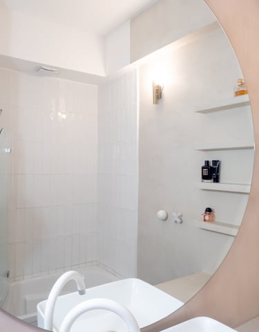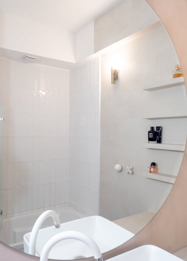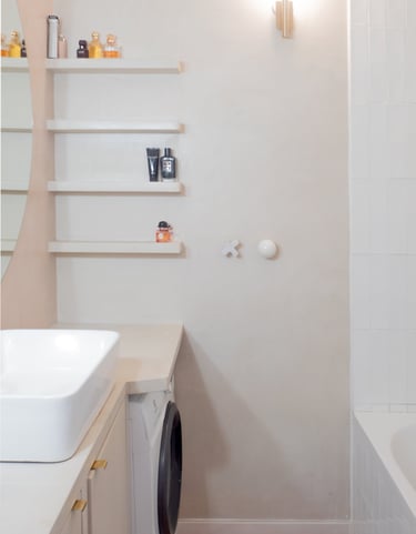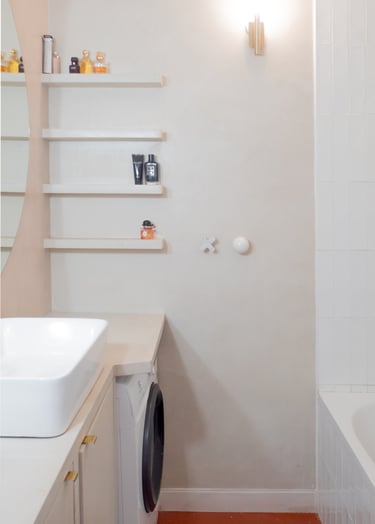 Enfin, la salle de bain a été réorganisée de manière fonctionnelle, incluant une baignoire et des toilettes séparées. Des rangements et un dressing sur mesure ont été intégrés dans le couloir pour maximiser l’espace disponible dans les chambres.