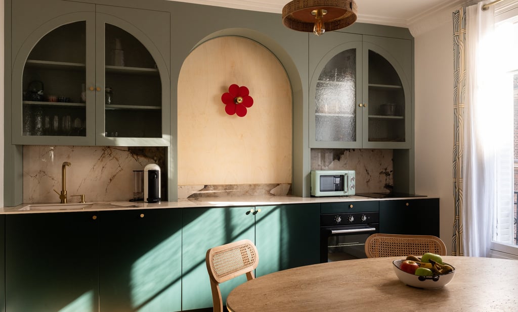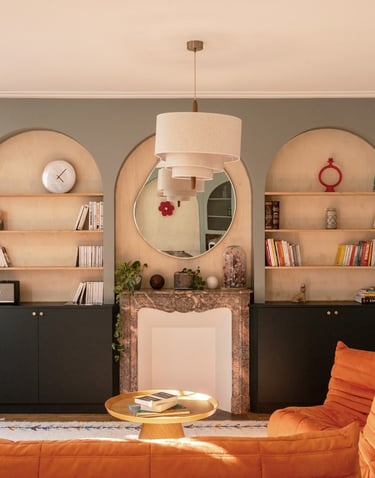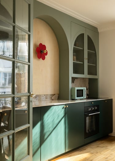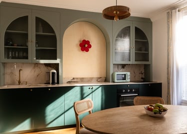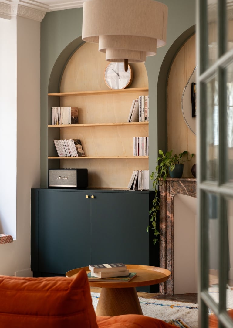 Le salon, avec son bow-window, constitue l'élément central de l’espace de vie. Pour le mettre en valeur, une banquette sur mesure a été installée. La cheminée a été reconstruite à son emplacement d’origine et s’intègre désormais comme pièce maîtresse de la bibliothèque. La cuisine, désormais ouverte sur le salon, reprend les lignes et les matériaux de la bibliothèque, avec un plan de travail en granit et des façades vert forêt, créant une atmosphère à la fois chaleureuse et élégante.