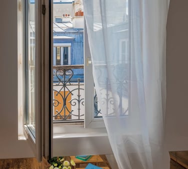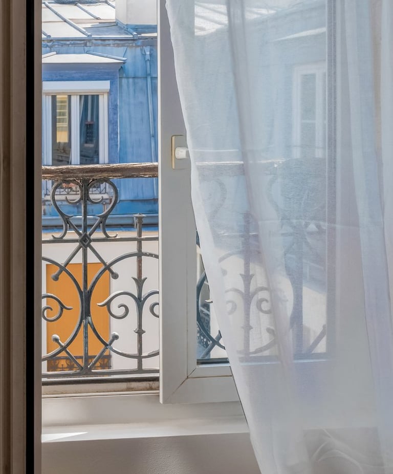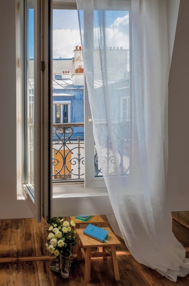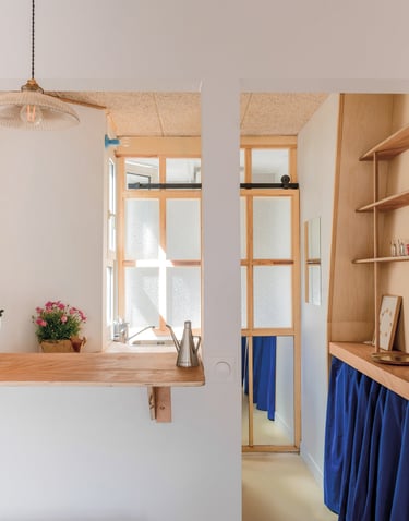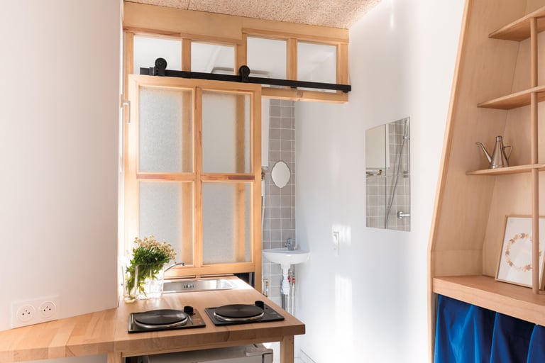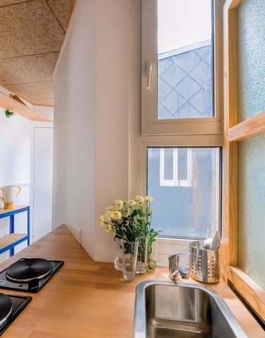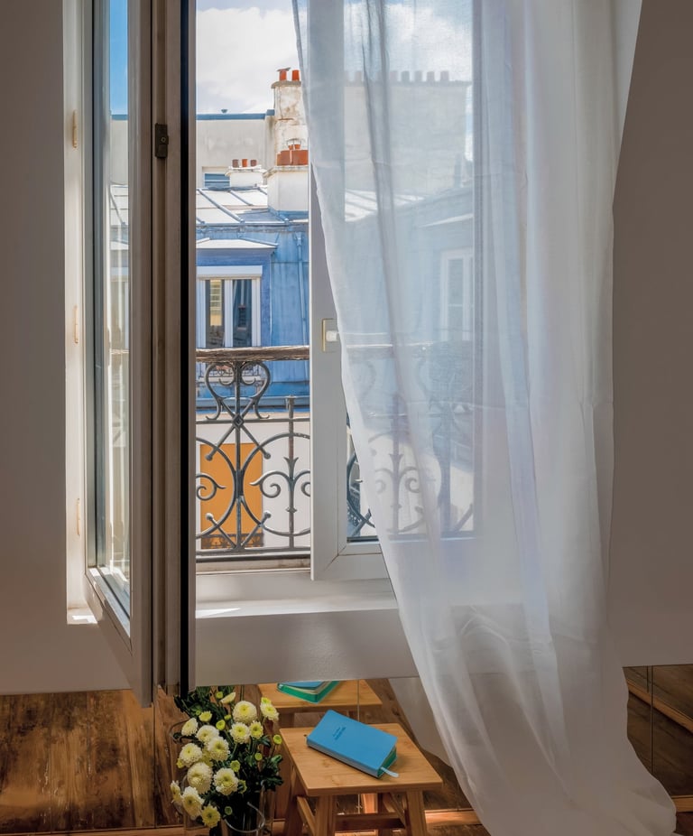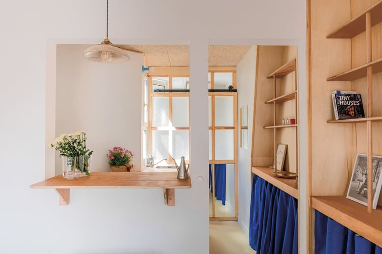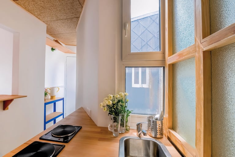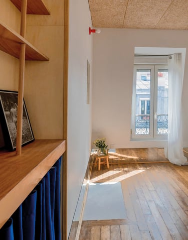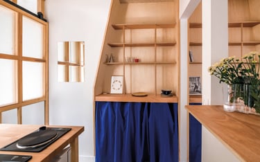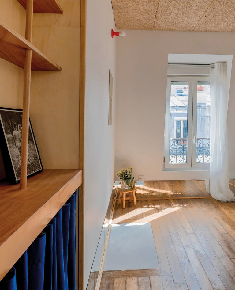 Le défi central du réaménagement de ce studio niché sous les toits parisiens, avec 9 mètres linéaires de façade pour une surface de 14m², a été sa rénovation énergétique sans perte d’espace.
