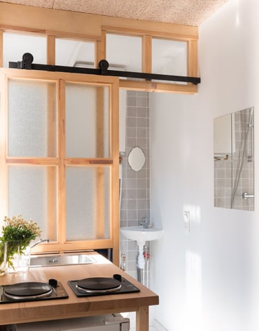 Grâce à l’emplacement du studio, nous avons pu agrandir sa surface à 16 m²en intégrant une partie du couloir et en ajoutant une fenêtre supplémentaire exposé est. Par le raccordement aux installations sanitaires de l’immeuble nous avons créé des vraies toilettes à l’intérieur de l’appartement.