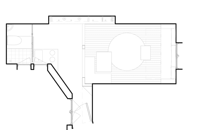 Sur cette nouvelle base nous avons cherché à optimiser au maximum l’espace intérieur avec un rangement astucieux et une organisation des différentes zones d’usage : entrée, bar / cuisine et salon. Chaque zone, y compris les toilettes, bénéficie d’une fenêtre créant ainsi un espace très lumineux avec des vues sur les toits parisiens zinc et ardoises.