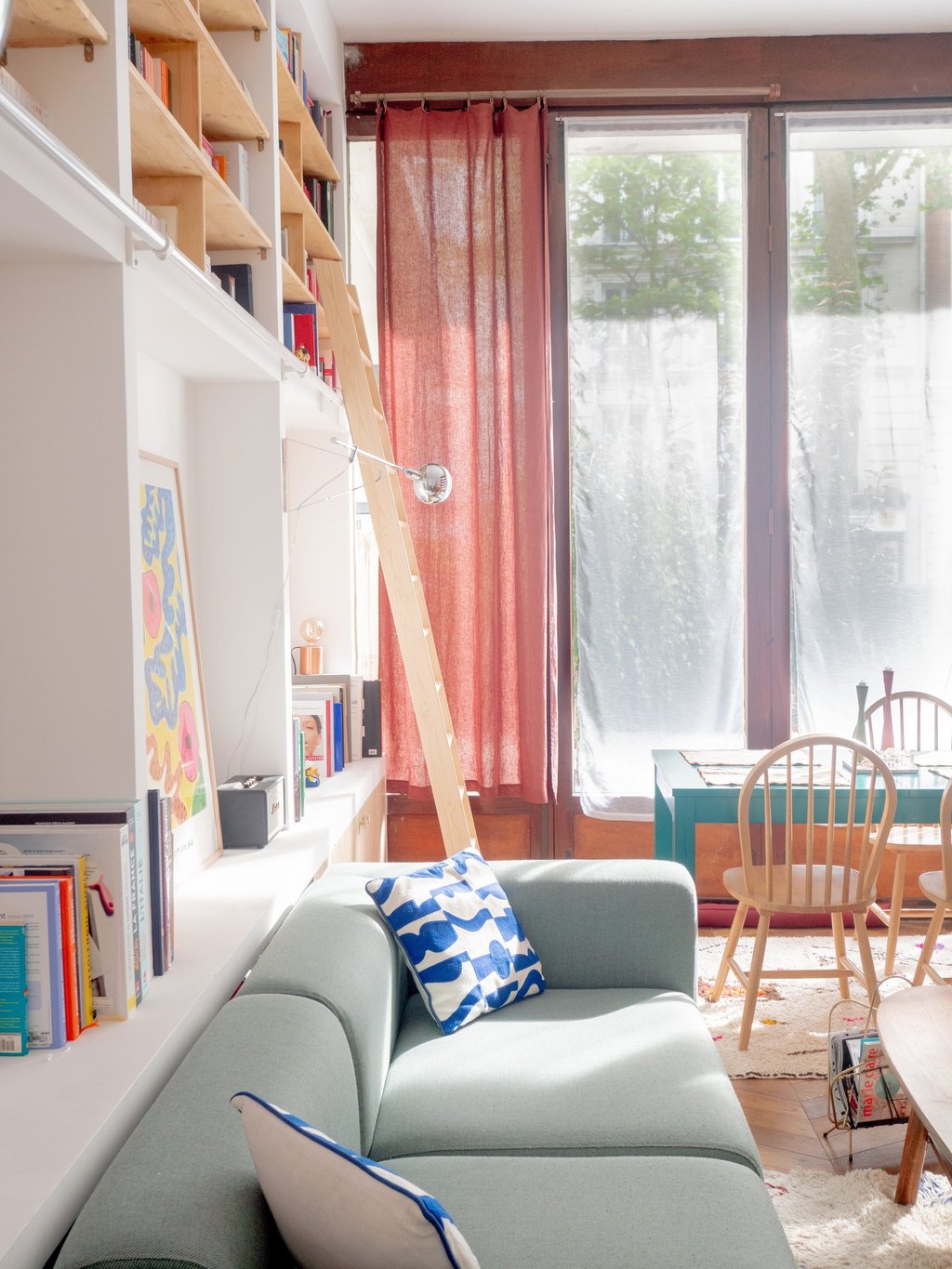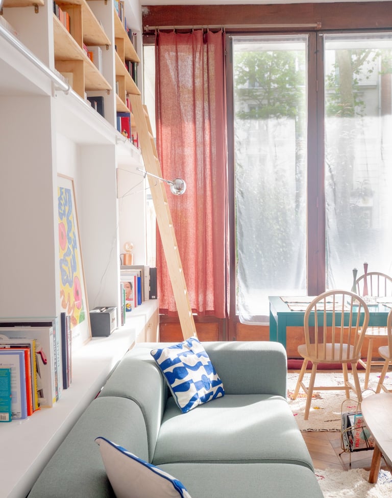 La grande hauteur sous plafond du salon a permis l’installation d’une bibliothèque sur mesure sans encombrer l’espace. L’espace nuit, composé de deux chambres, a été visuellement agrandi grâce à l’ajout d’une verrière réalisée à partir des anciennes menuiseries en bois des fenêtres. Le choix de couleurs, avec des menuiseries en bois rouge vif et un mur bleu clair, apporte une touche de gaieté.