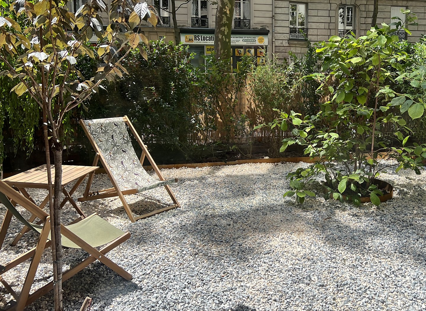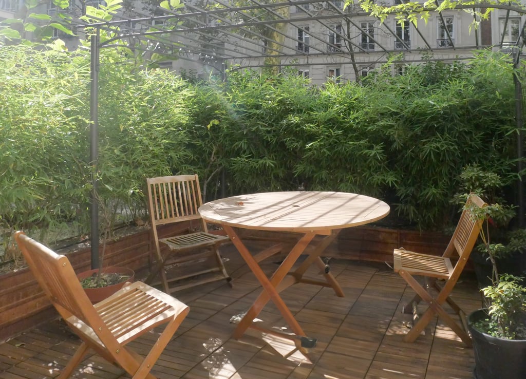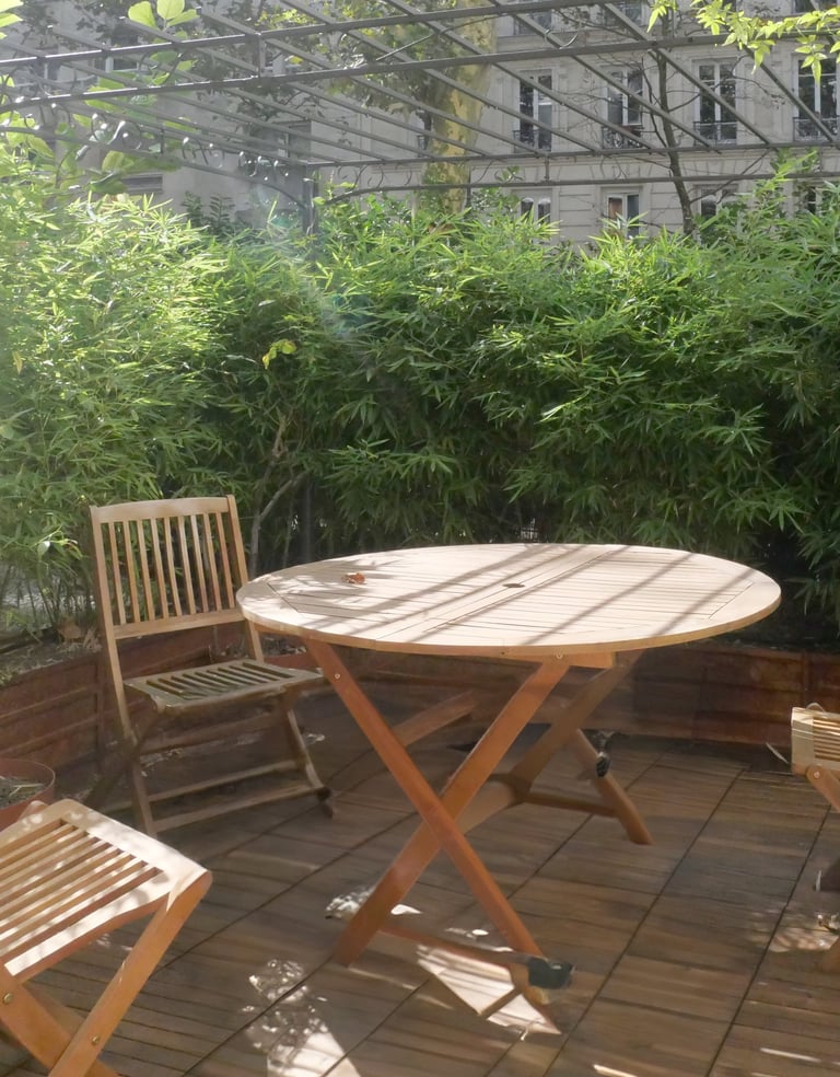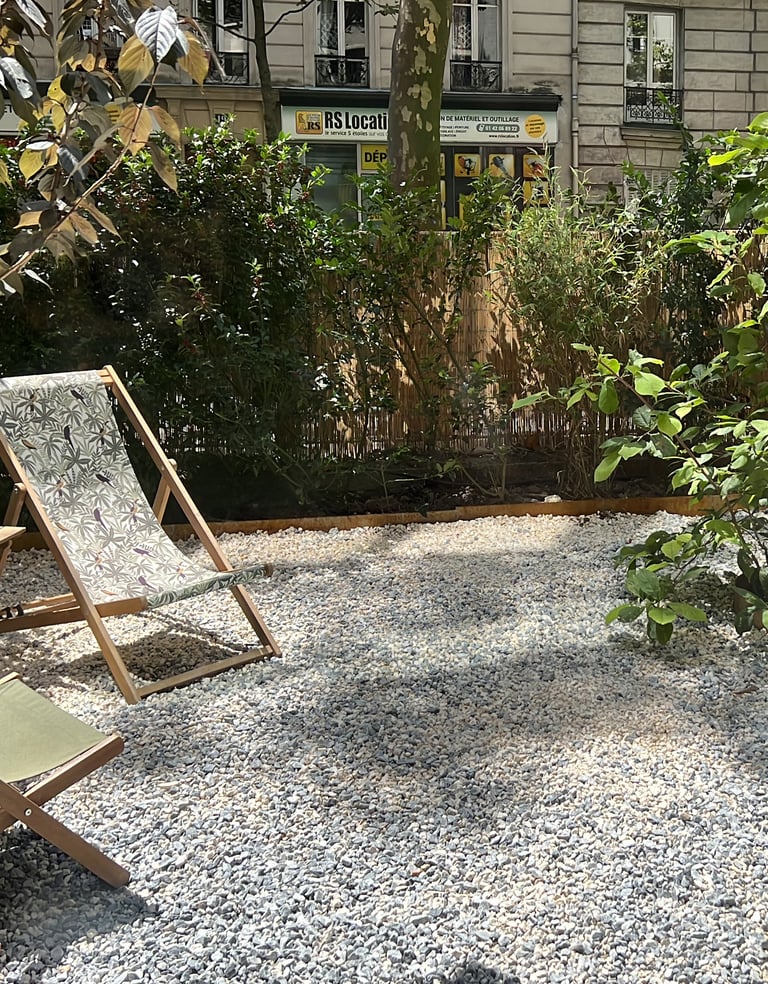 La transformation de cet appartement situé au rez-de-chaussée d'un immeuble parisien lui confère l'allure d'une maison de ville, notamment grâce à son ouverture sur un jardin privatif. Ce jardin a été entièrement repensé pour offrir une atmosphère intime. Deux espaces distincts y ont été aménagés : une zone minérale en prolongement du salon, agrémentée de deux bouleaux et d’un magnolia, et un coin salon d’été, niché entre une haie de bambous et un mur pignon recouvert des jasmins.