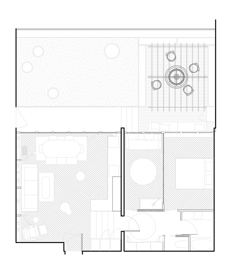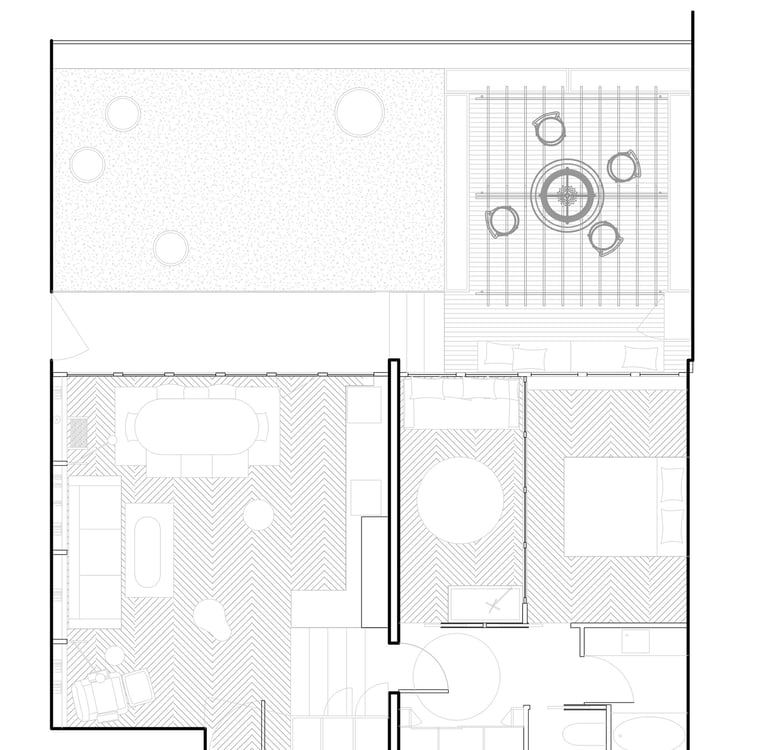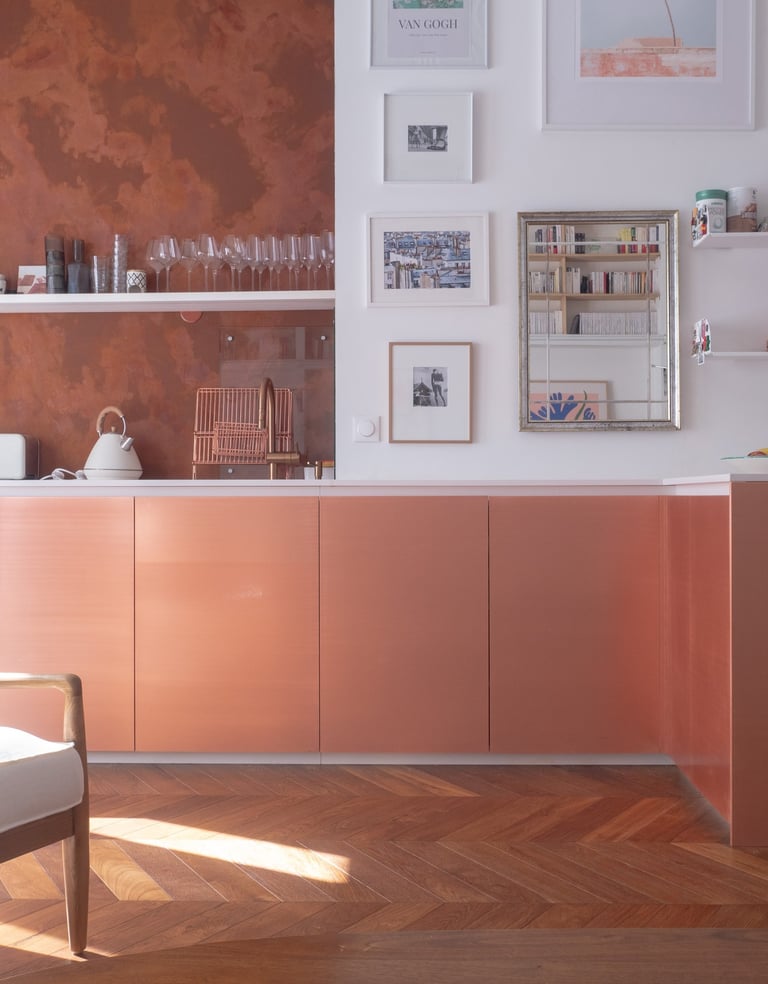 L’agencement atypique du lieu, avec 3,6 mètres de hauteur sous plafond dans le salon et un dénivelé de 80 cm séparant la zone nuit, assure une distinction claire entre les espaces de jour et de nuit. Le défi principal de ce projet était la création d’une chambre supplémentaire. Pour ce faire, la cuisine a été déplacée dans le salon. Ses modules, sobres et habillés en cuivre, se fondent dans le volume du salon, apparaissant comme un objet sculptural.