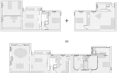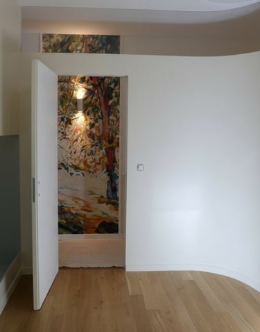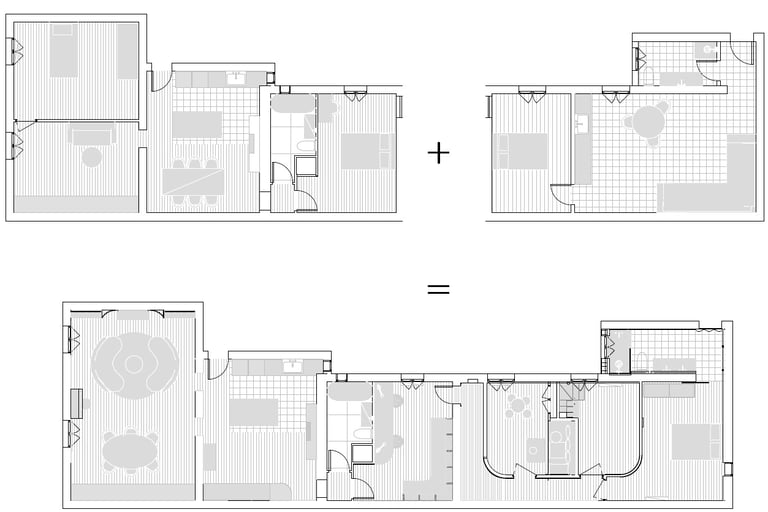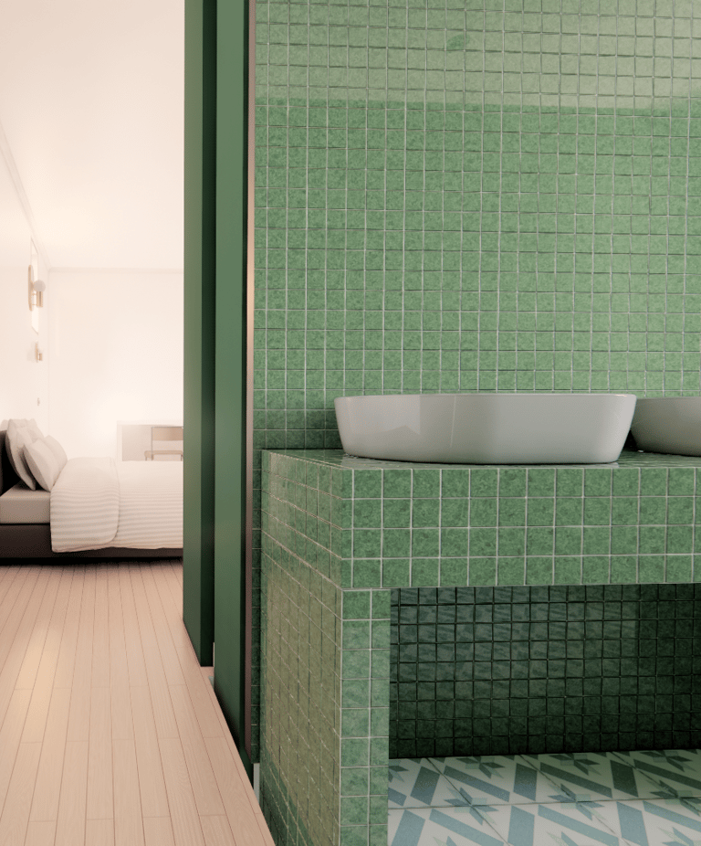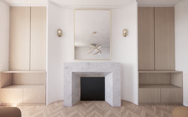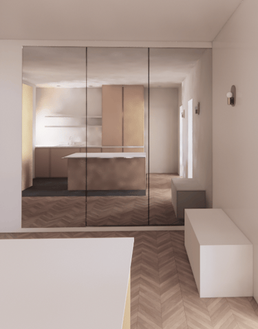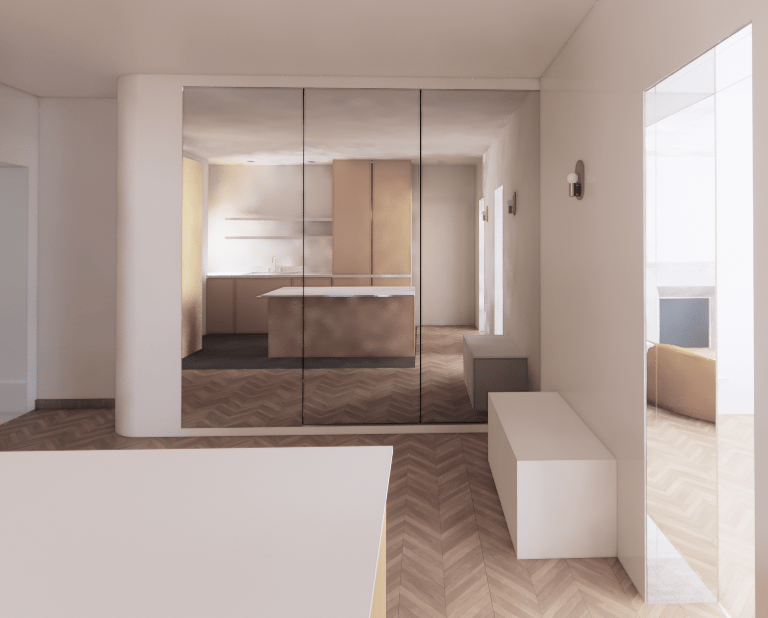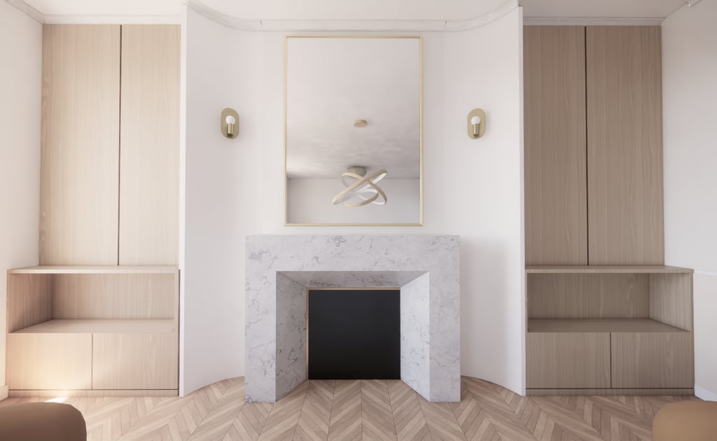 Enfin, nous avons mis une plinthe en miroir dans le salon qui crée un effet de trompe l’œil, augmentant ainsi visuellement l’espace.
