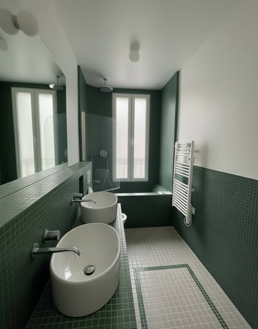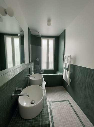 Sur cette nouvelle base nous avons cherché à optimiser au maximum l’espace intérieur avec un rangement astucieux et une organisation des différentes zones d’usage : entrée, bar / cuisine et salon. Chaque zone, y compris les toilettes, bénéficie d’une fenêtre créant ainsi un espace très lumineux avec des vues sur les toits parisiens zinc et ardoises.