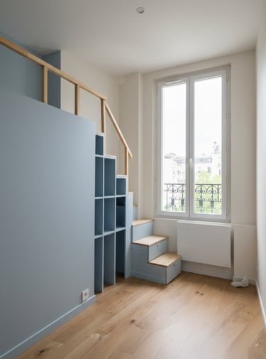 Le défi central du réaménagement de ce studio niché sous les toits parisiens, avec 9 mètres linéaires de façade pour une surface de 14m², a été sa rénovation énergétique sans perte d’espace.