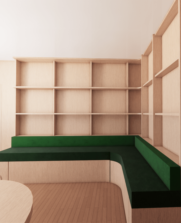 Pour mettre en avant sa luminosité nous avons privilégié les couleurs claires comme le jaune paille ou le gris zinc pour le carrelage et des matériaux naturels comme le bois massif en chêne. Dans cette optique, nous avons laissé l’isolation du plafond en fibre de bois apparente. Cela maximise la hauteur sous plafond et, ensemble avec le sol jaune citron, donne une perception de largeur à l’espace. Le mobilier, avec ses touches bleu électrique, dynamise l’ensemble.