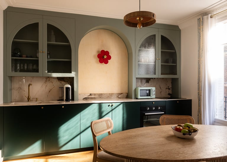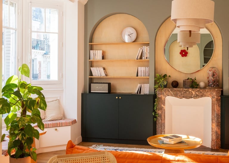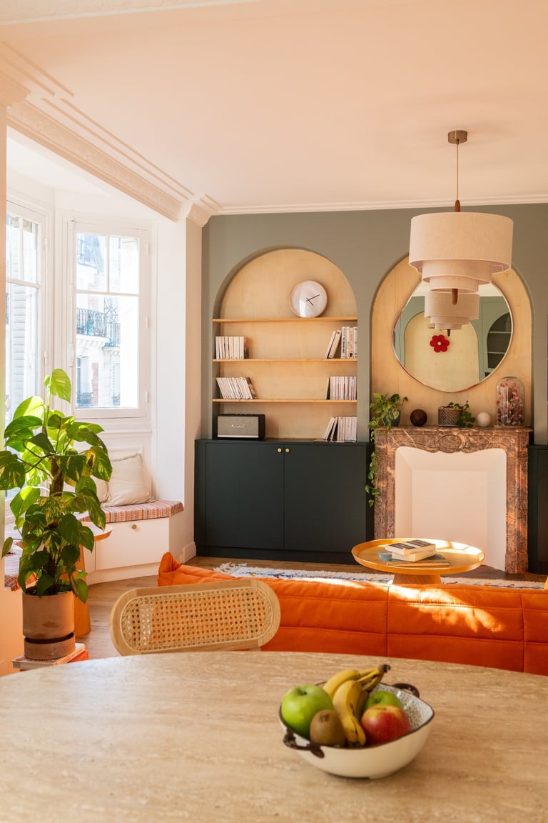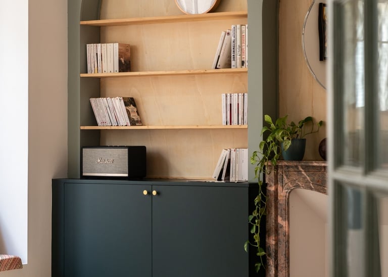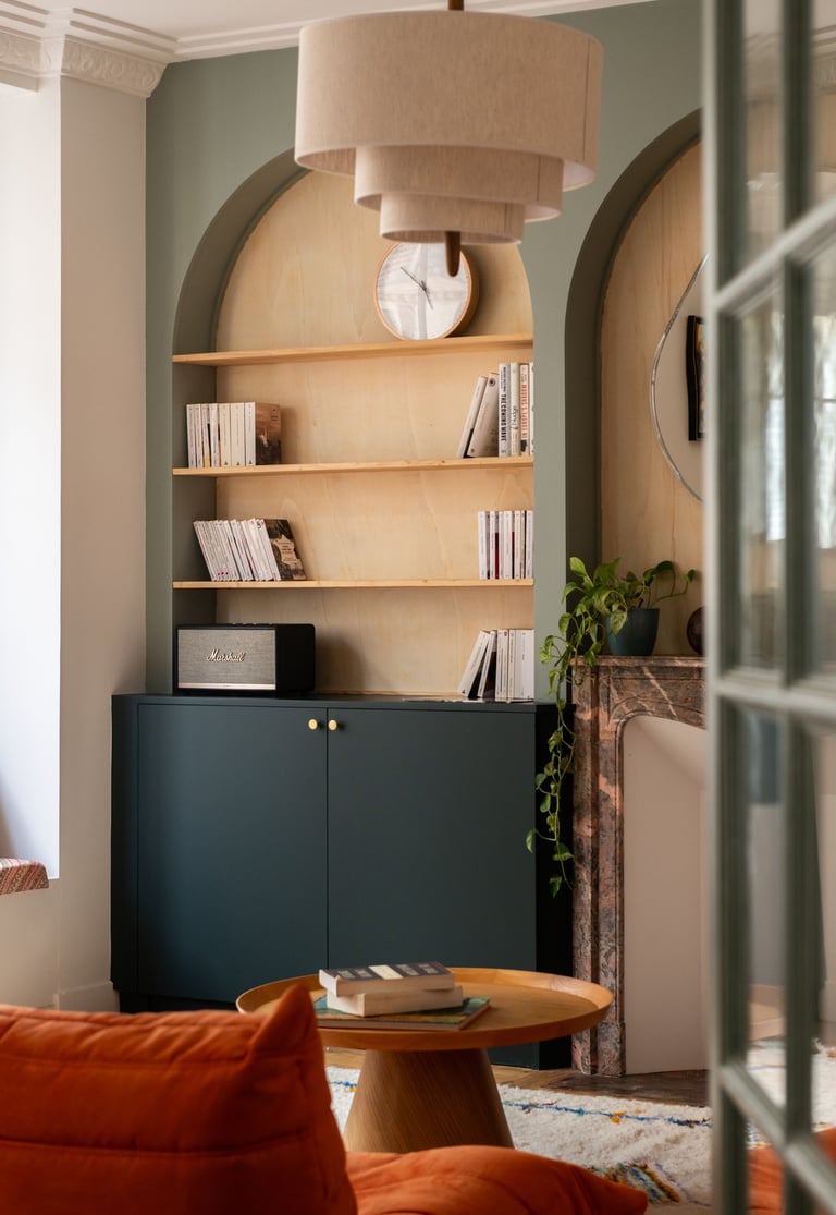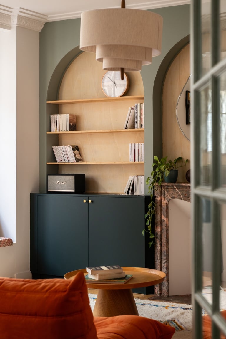 Le salon, avec son bow-window, constitue l'élément central de l’espace de vie. Pour le mettre en valeur, une banquette sur mesure a été installée. La cheminée a été reconstruite à son emplacement d’origine et s’intègre désormais comme pièce maîtresse de la bibliothèque. La cuisine, désormais ouverte sur le salon, reprend les lignes et les matériaux de la bibliothèque, avec un plan de travail en granit et des façades vert forêt, créant une atmosphère à la fois chaleureuse et élégante.