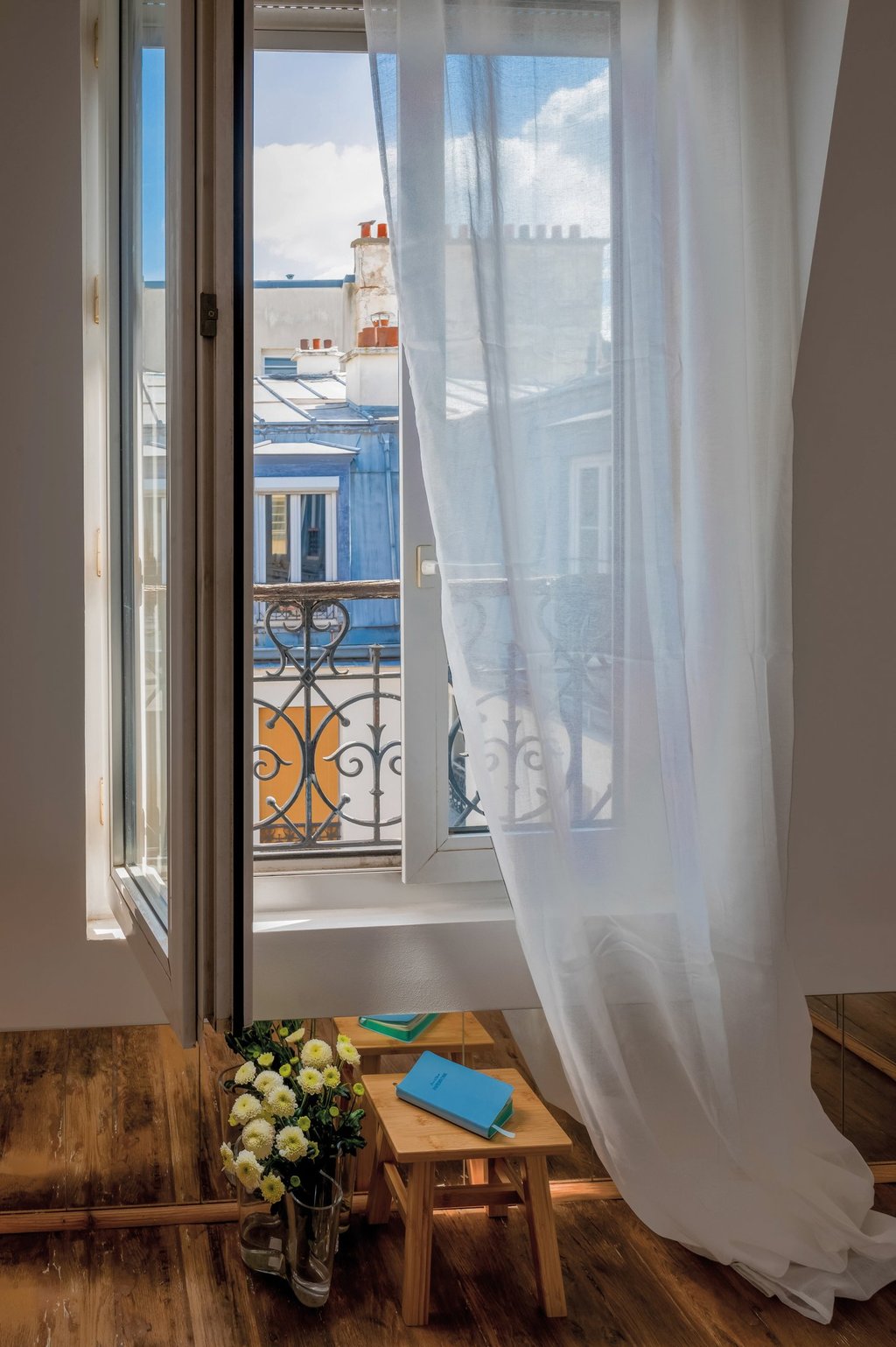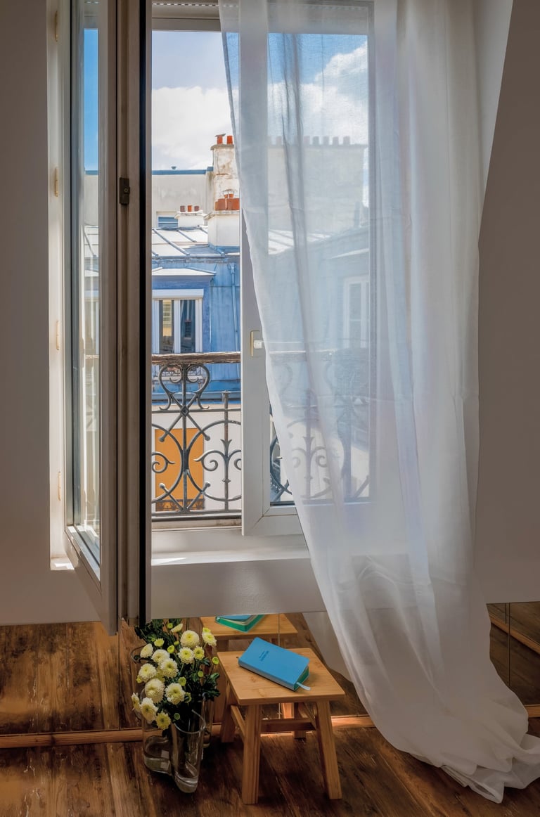 Le défi central du réaménagement de ce studio niché sous les toits parisiens, avec 9 mètres linéaires de façade pour une surface de 14m², a été sa rénovation énergétique sans perte d’espace.